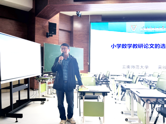 在评课结束后,云南师范大学教授吴骏开展了《小学数学教研论文的选题与写作》专题讲座。吴骏在讲座中深入且细致地阐述了论文与教育教学实践的紧密联系,通过丰富的实例、深入浅出的讲解,让参训教师们对教研论文的选题与写作有了更清晰的认识和把握。