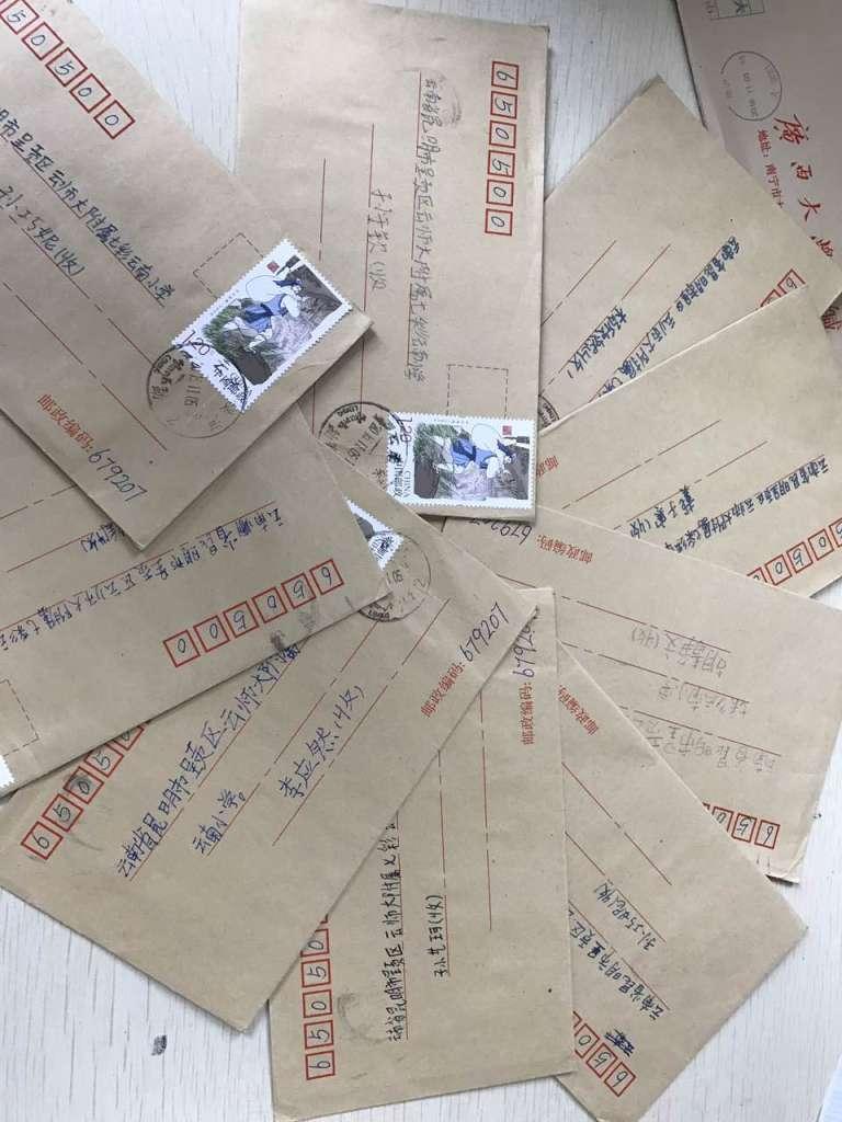 云南师范大学附属七彩云南小学的孩子们在10月中旬,写了人生中的第一封信,而且是给千里之外梁河县勐养镇中心学校的乡下孩子们写信。他们未来可能会成为朋友?可能会相见……这些已经足以让孩子们激动不已。认真的眼神、激动的心情、工整清秀的字迹全都装进了这一封陌生又熟悉的信封里,有些孩子还在里面放了一支铅笔、一页书签、一张贴画……当做小礼物,交给那一张张小小的邮票,寄到千里之外。